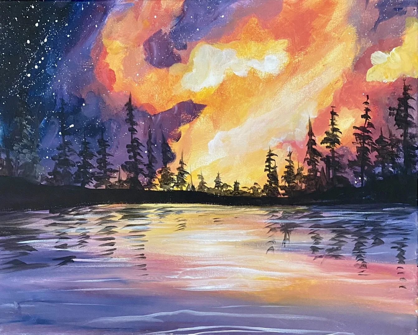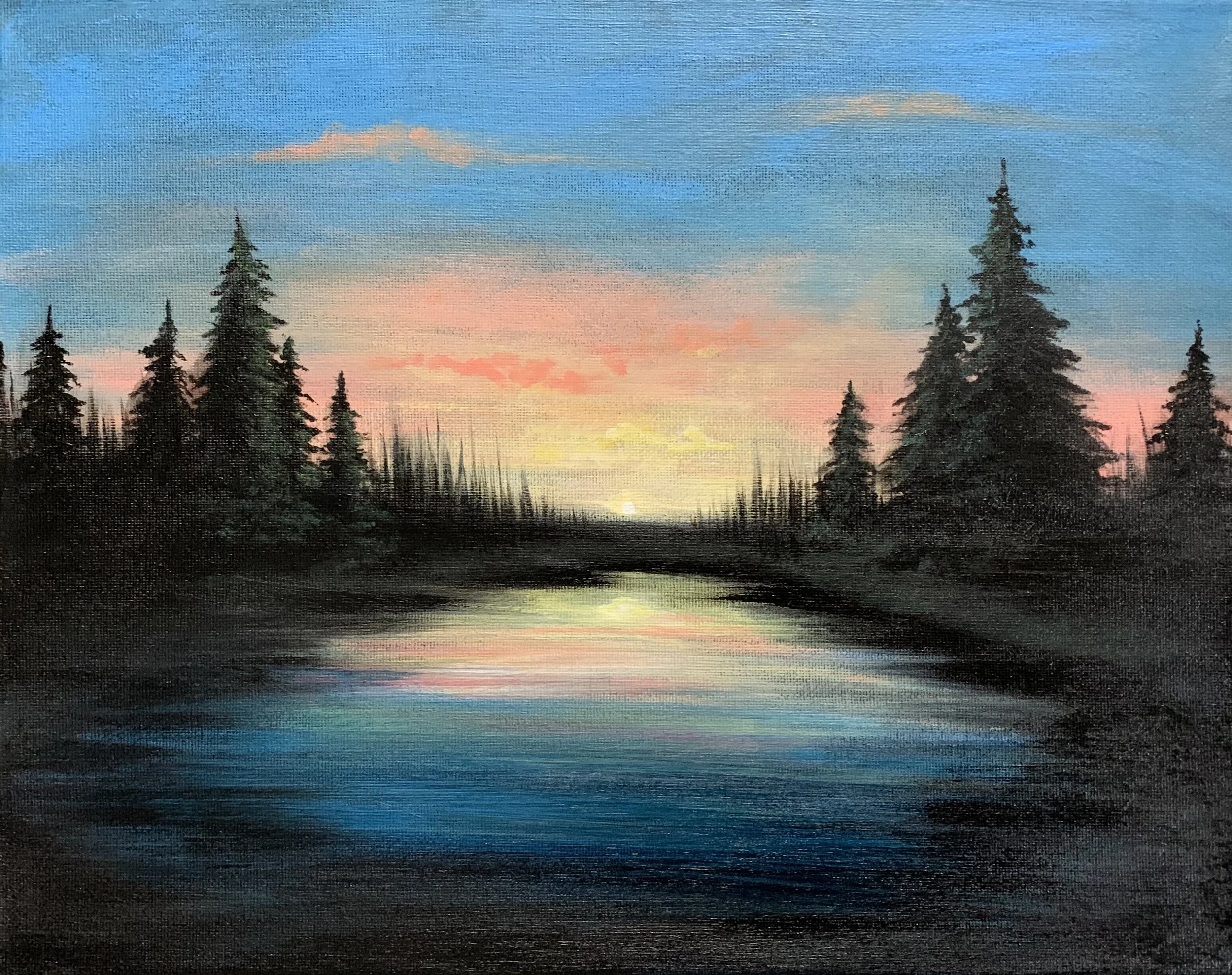 "Soft Twilight" is a beautiful painting that captures the beauty and tranquility of a sunset. The warm hues create an inviting atmosphere and the black silhouettes of pine trees stand tall and proud, adding a touch of contrast and depth to the scene. The reflection of the sunset in the calm waters of the lake creates a sense softness that is both captivating and soothing.