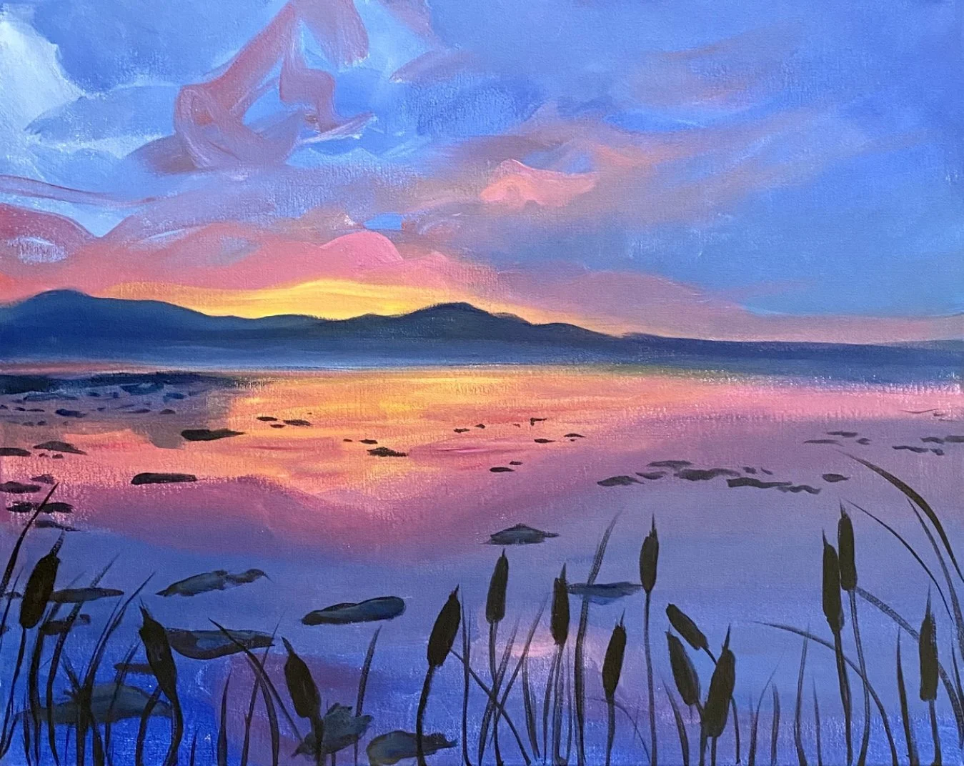 "Still Waters" is a painting that skillfully depicts the beauty of nature, evoking a sense of tranquility. The warm, golden sunset contrast beautifully with the cool blues of the water and sky, creating a harmonious and balanced composition. The distant mountains add depth to the painting, while the cattails in the foreground add texture and detail.