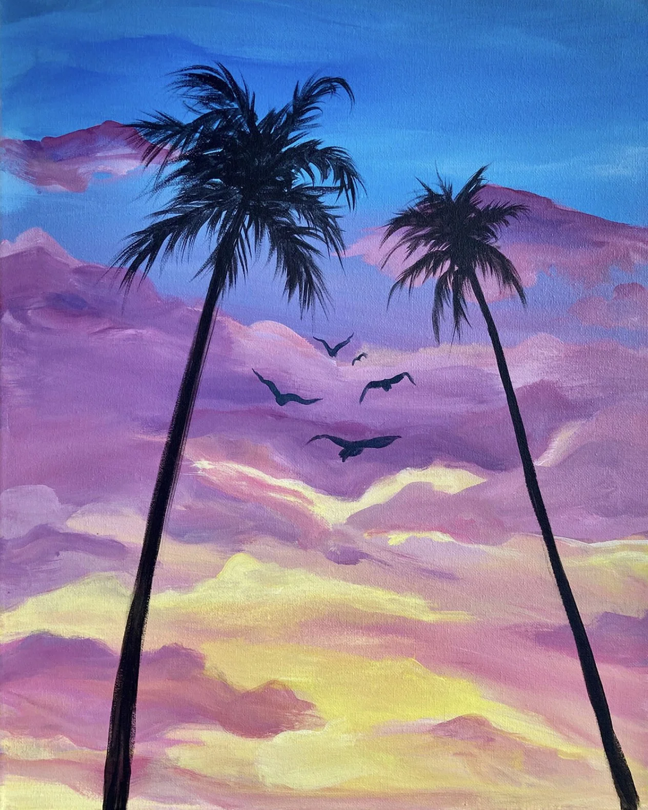 "Tranquil Tropics" is a serene painting that transports the viewer to a tropical paradise. Featuring two tall, skinny palm trees standing against a vibrant sunset. Birds fly off into the distance, creating a feeling of movement. The sky is painted with rich and vibrant colors, creating a sense of tranquility and warmth.