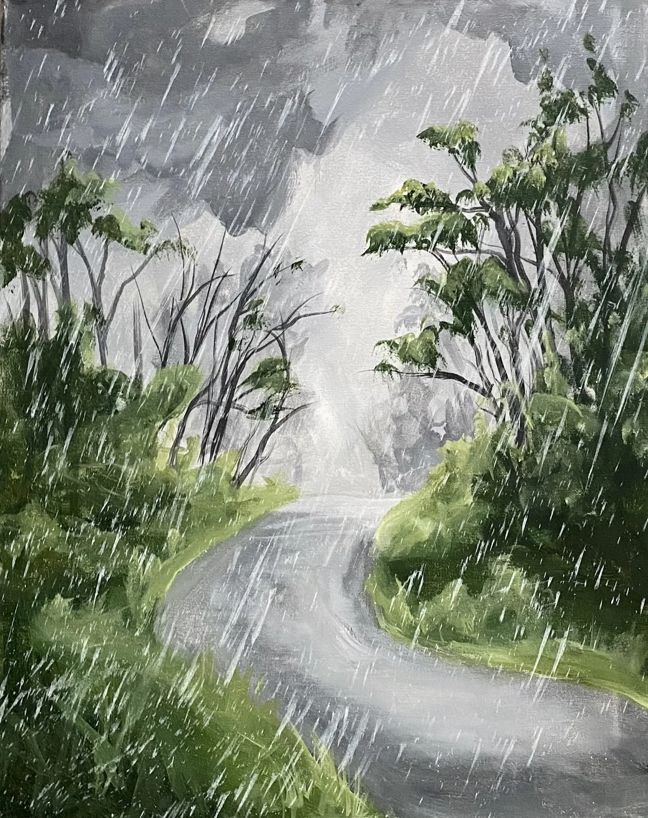 "Rainy Day Symphony" is a stunning painting that captures the beauty of a rainy day. The dark clouds create excitement and anticipation, while the vibrant green trees and tall grass add a touch of vibrancy to the scene. The raindrops falling from the sky bring a sense of liveliness to the painting, while the winding road inspires a sense of adventure and exploration.