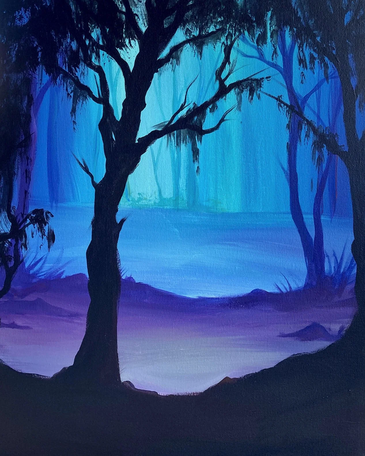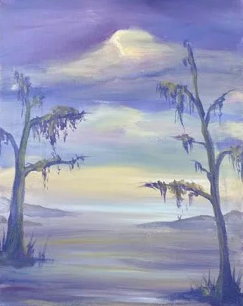 "Mossy Marsh" is a serene and atmospheric painting that captures the tranquility of a marshland. Two tall trees stand proudly with their trunks covered in a thick layer of moss and their branches draped with wispy strands of moss that sway gently in the breeze. The colors used are muted hues of blues and purples.