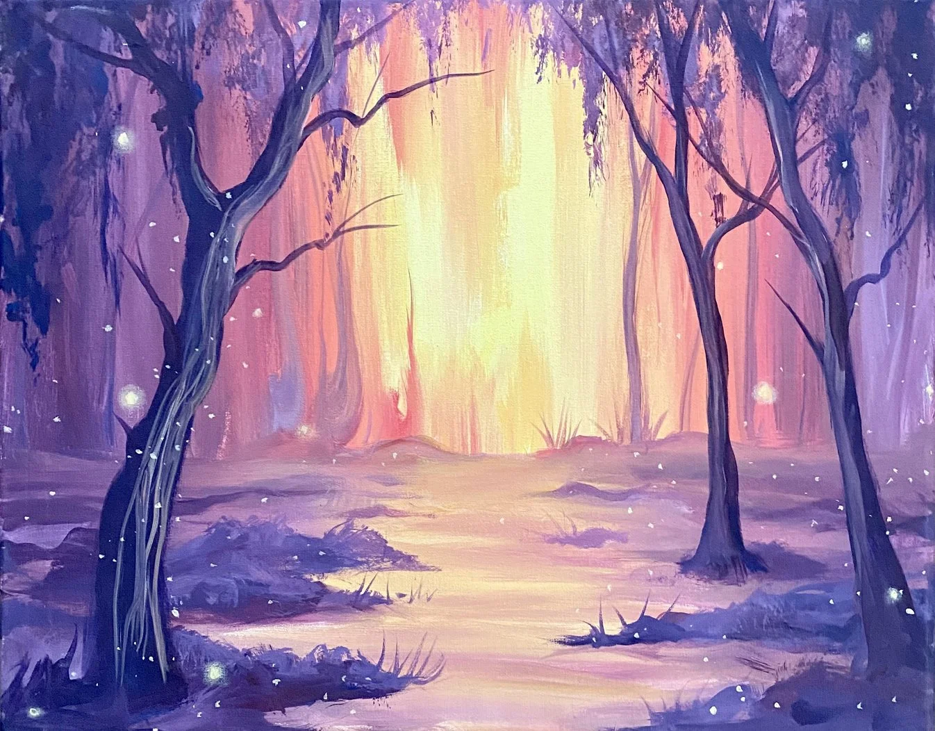 "Whimsical Grove" is an enchanting painting that portrays a mystical woodland bathed in golden sunlight. Featuring tall trees surrounded by a group of fireflies that dance playfully, their luminescent glow adding to the whimsical atmosphere. The fireflies seem to be guiding the viewer through the grove, creating a sense of wonder and magic.