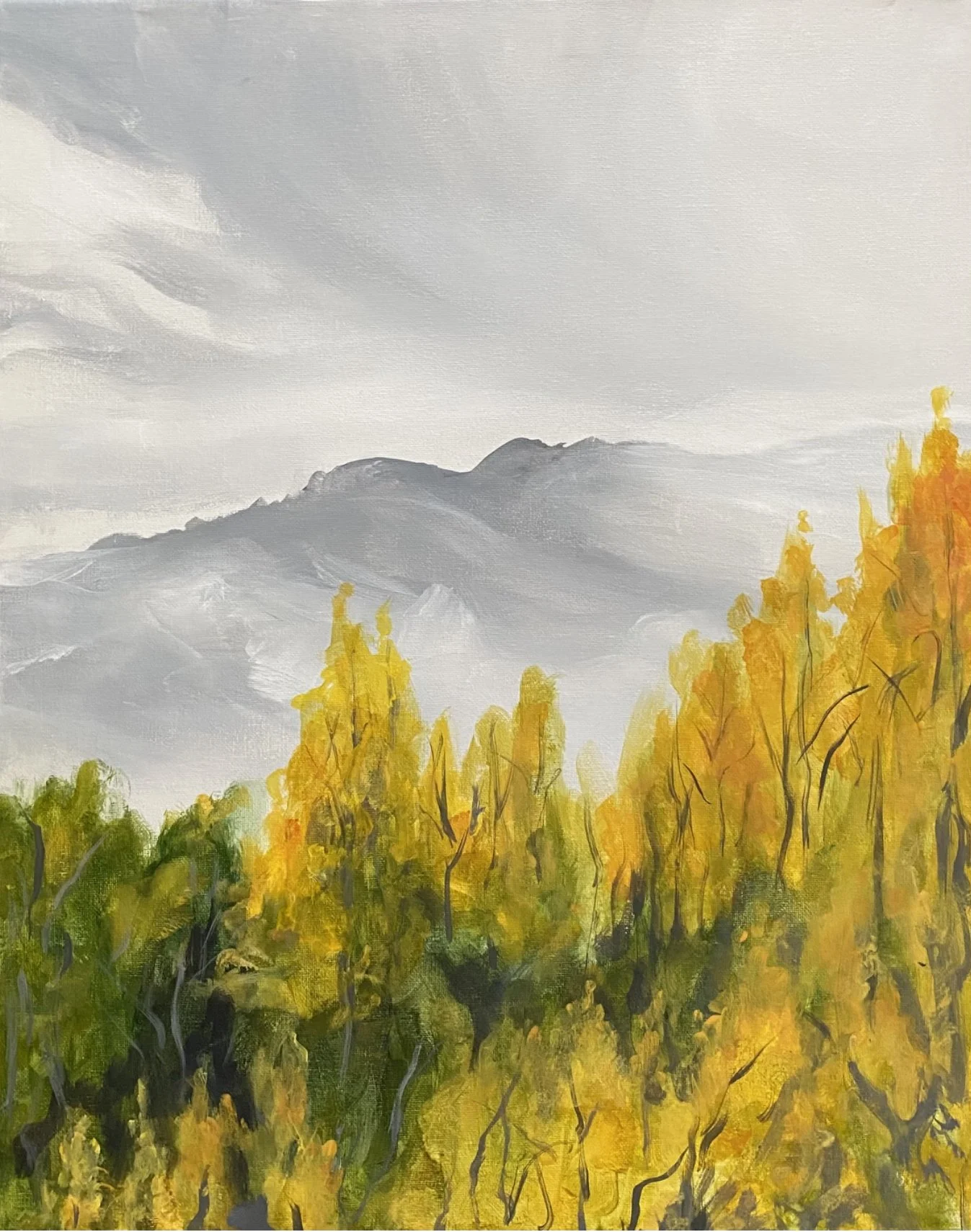 "Golden Aspens" is a stunning painting that portrays tall aspens set against a clear blue sky. The painting captures the essence of autumn, with the leaves gently rustling in the breeze. The tall and slender trunks of the aspens create an impressive vertical structure that fills the canvas, drawing the viewer's eye upward towards the treetops.