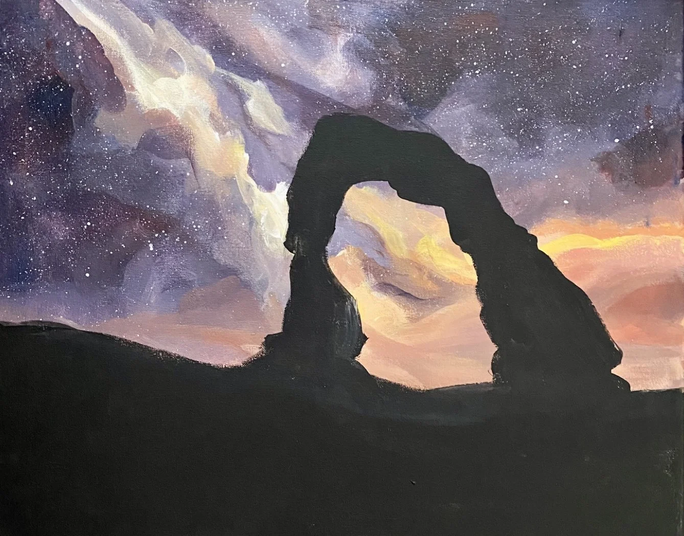 "Arch of the Stars" is a stunning painting that captures the essence of the night sky in all its beauty. The artist has skillfully portrayed the delicate balance between the natural world and the cosmos, with the rock arch standing as a symbol of strength and stability against the infinite expanse of the galaxy sky.