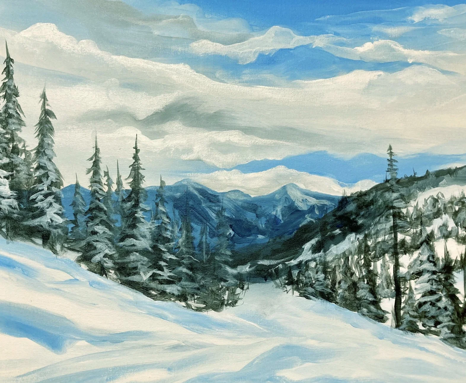 The painting "Snowy Solitude" skillfully conveys the tranquil stillness of a winter landscape with its snowy pine trees, distant mountains, and serene blue sky. The cool tones used by the artist create a sense of peacefulness, while the distant mountains add a touch of grandeur and majesty to the painting, reminding us of the awe-inspiring power of nature.