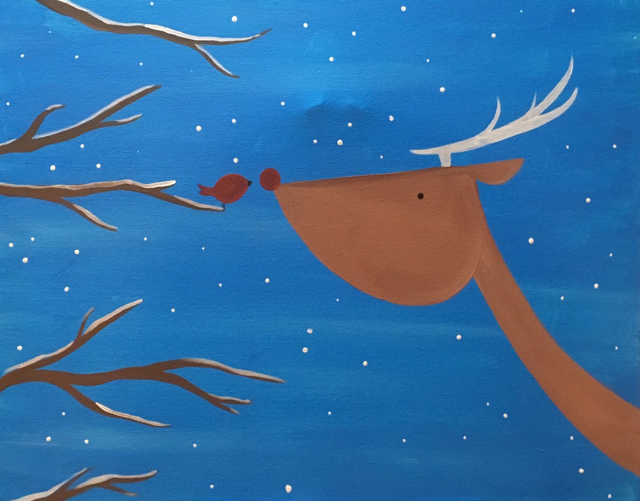 "Reindeer's Winter Friend" is a heartwarming painting that captures the beauty of nature in the wintertime. The snowflakes gently falling from the sky create a serene atmosphere, while a vibrant red bird sits perched on a branch as curious reindeer looks on at the bird, creating a sense of companionship between the two animals.