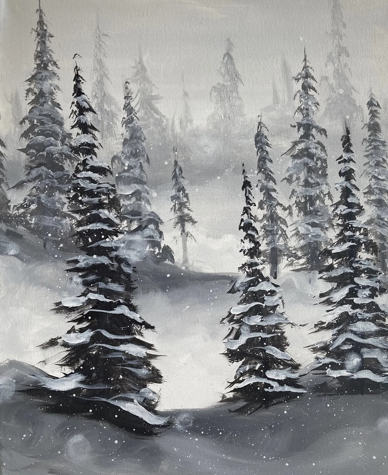 "Winter Pines" is one of stillness and serenity, inviting the viewer to immerse themselves in the peaceful atmosphere of the winter forest. The falling white snow that covers the landscape creates a sense of purity, while the dark pine trees that dominate the painting, stand tall and proud against the snow.