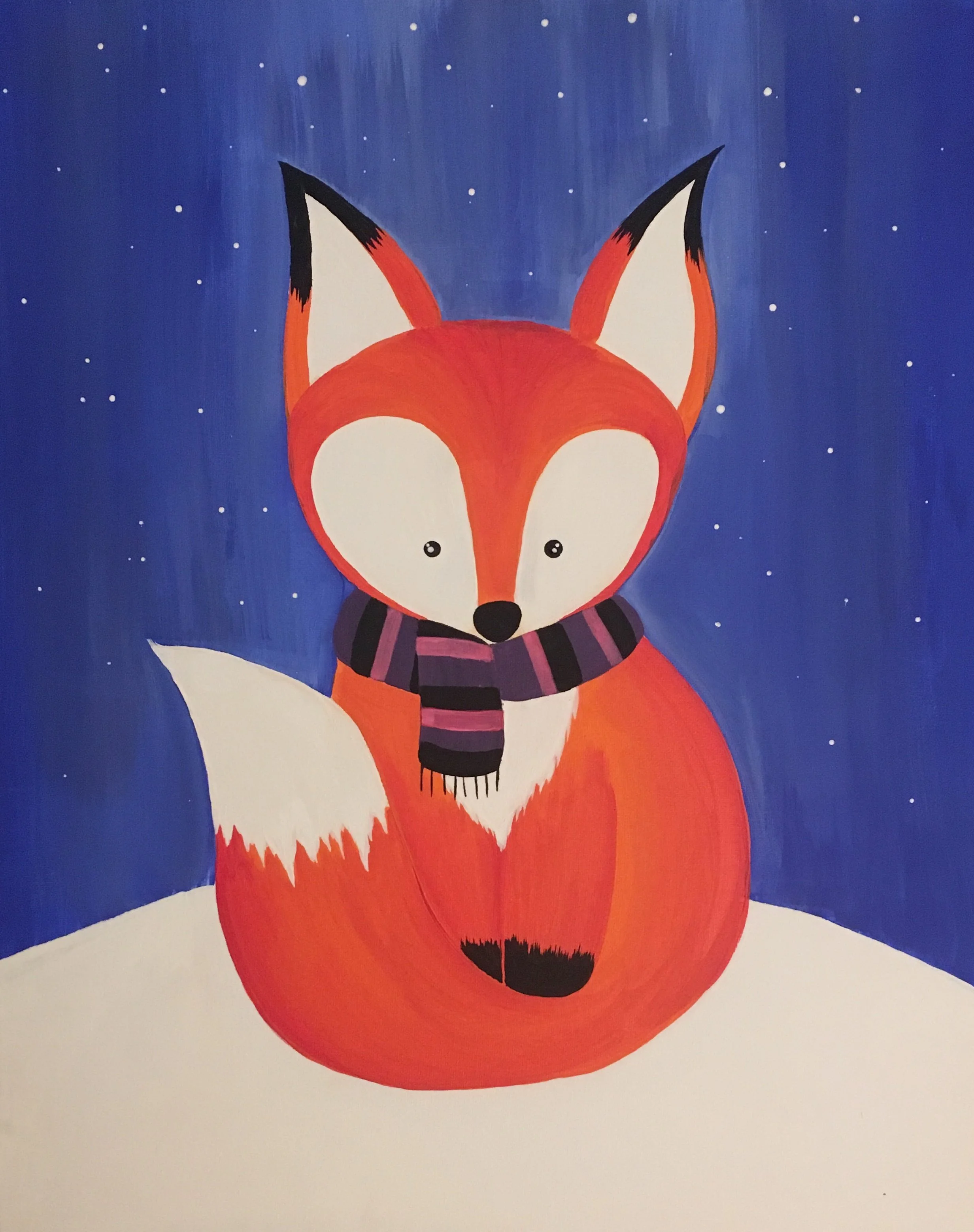 “Winter Fox” is a charming painting that beautifully depicts a playful winter landscape. The painting features a deep blue sky with snowflakes gently falling, creating a peaceful and calming atmosphere. A fluffy fox sits atop a snowy hill, adding an element of warmth to the scene.