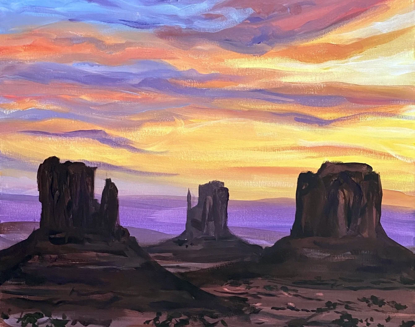 "Desert Dreamscape" is a mesmerizing painting that captures the raw beauty of the desert landscape. The painting features towering buttes that stand tall against the vibrant sunset. The play of light and color creating a sense of warmth and tranquility that transports the viewer to a peaceful world.