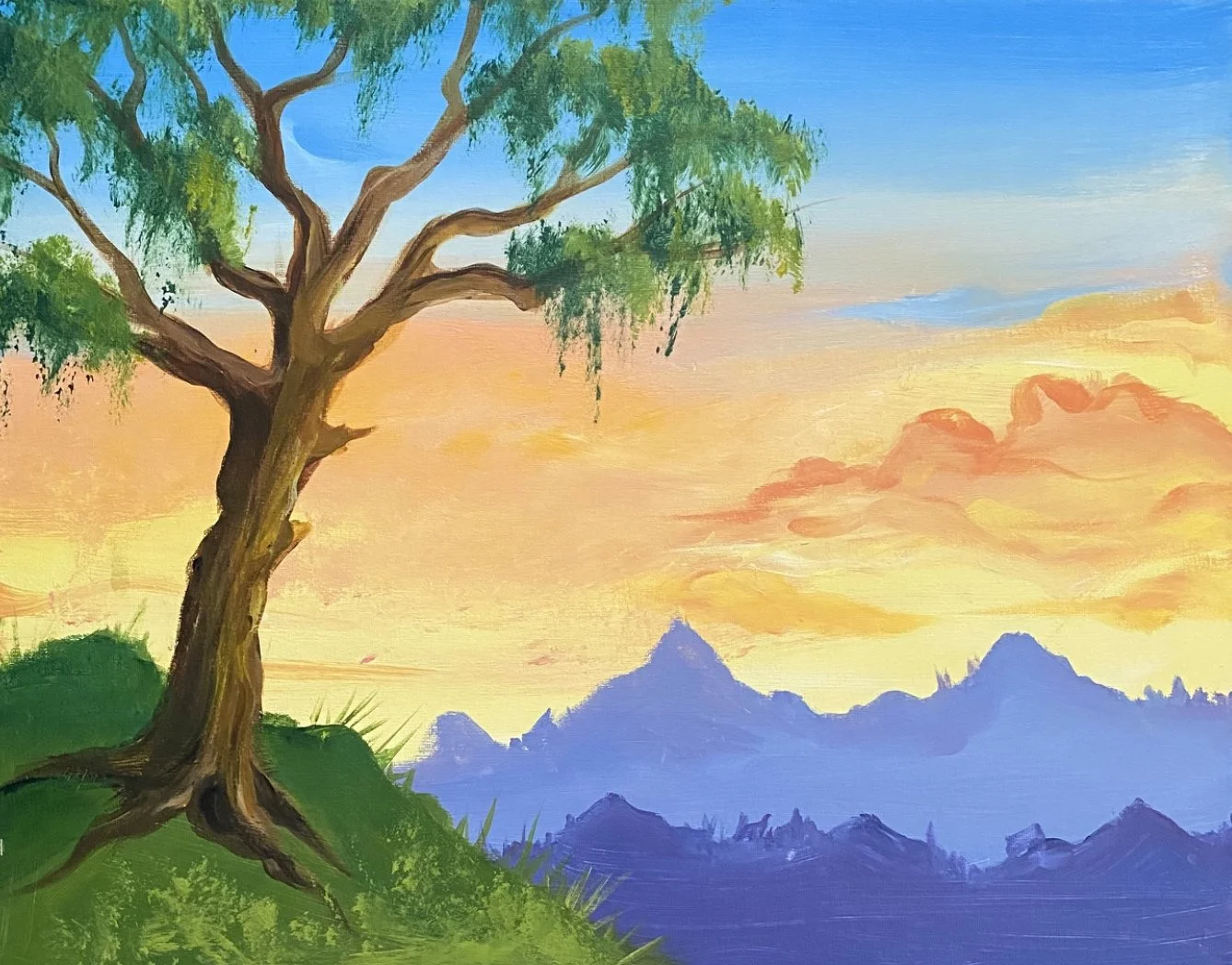 "Serene Sunset" is a beautiful painting featuring a green grass hill with a tree, set against a warm sunset with clouds and mountains in the distance. The colors are rich and vibrant, creating a sense of peace and tranquility. It's a stunning work of art that captures the beauty of nature.