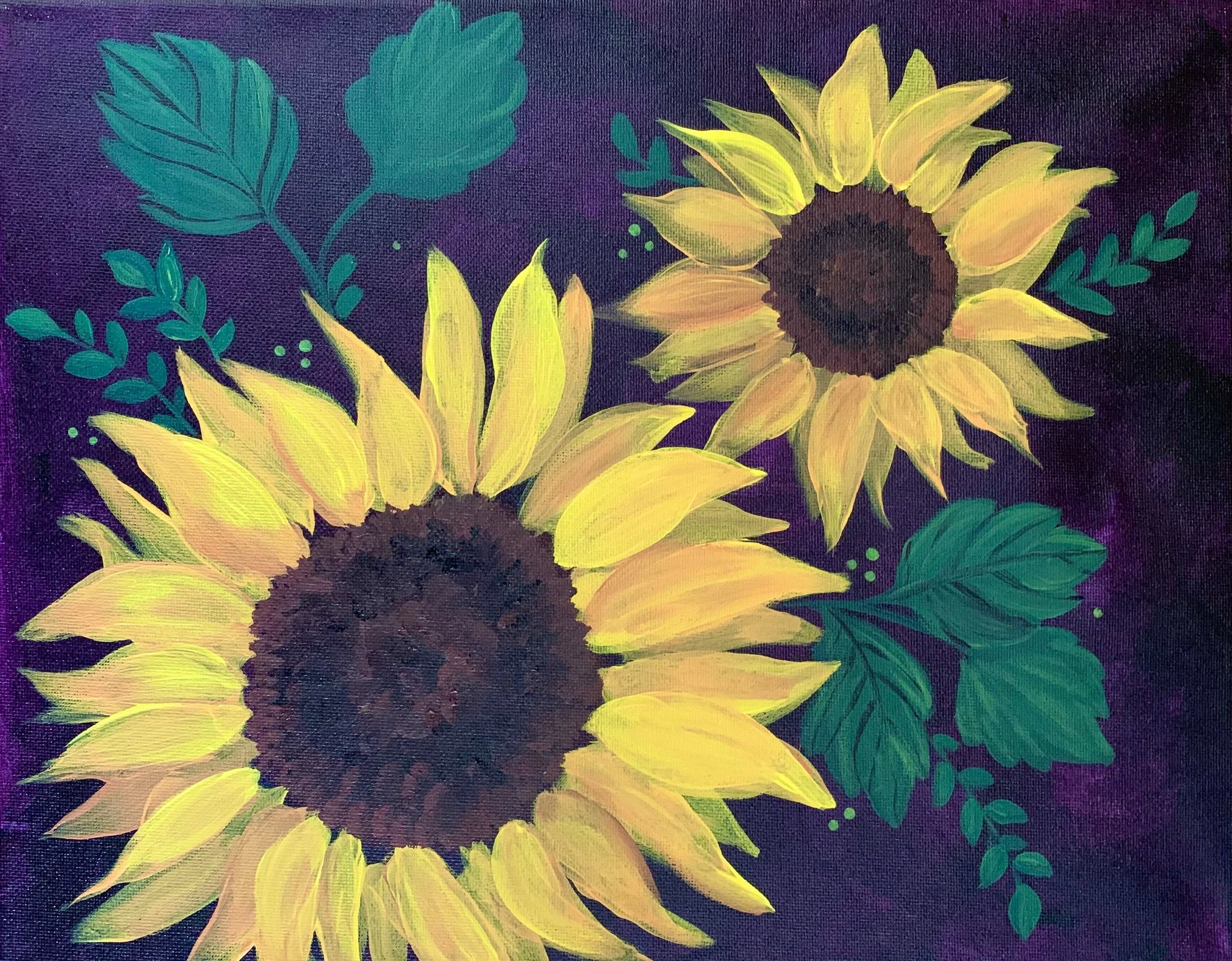 "Sunflower Duo" is a striking painting that features two large sunflowers set against a deep plum background. The bold contrast of the yellow petals and deep purple hues create an eye-catching effect. Surrounding the sunflowers are lush green leaves, adding depth and texture to the painting and highlighting the natural beauty of the flowers.