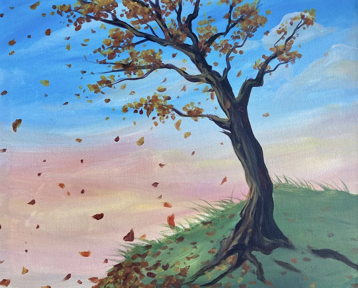 "Harvest Dawn" is a beautiful painting capturing the essence of autumn. The scene depicts a grassy hill, illuminated by the warm light of a rising sun. As a gentle breeze blows through the hill, some of the leaves break free from the tree and dance through the air, adding to the magical ambiance of the painting.