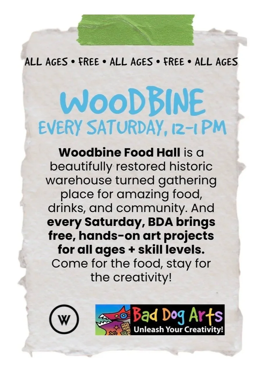 Join us at Woodbine Food Hall, a beautiful restored historic warehouse turned gathering place, for amazing food, drinks and community! Every Saturday, a BDA artist brings free, hands-on art projects for all ages and skill levels. Come for the food, stay for the creativity!